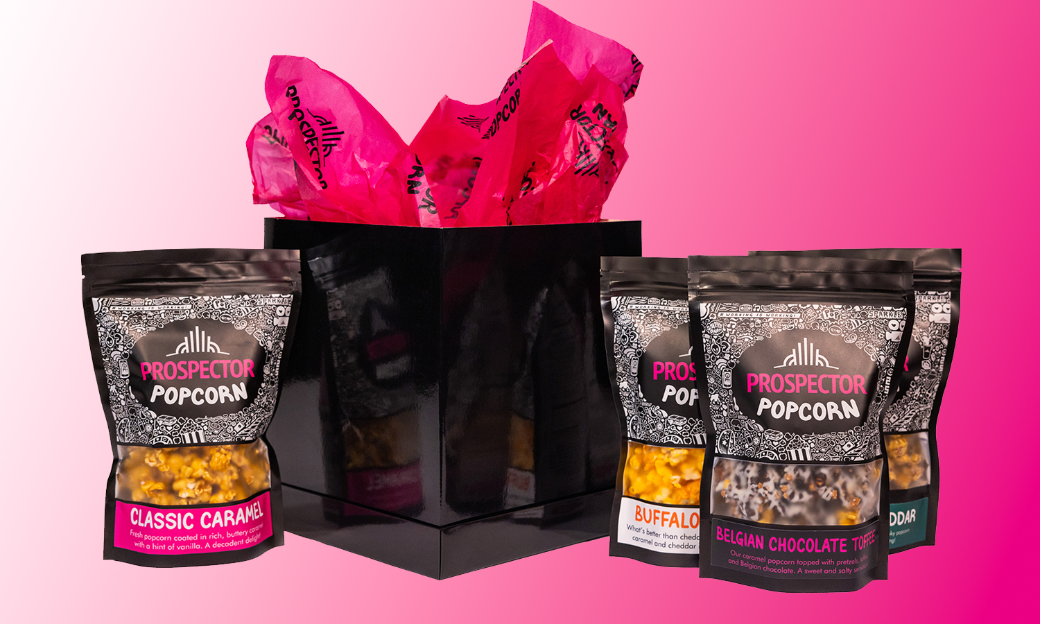 At Prospector Popcorn, we specialize in crafting unique flavors, exquisite gift wrapping, and bespoke packaging tailored to your company's needs. Whether it's a brand launch, a corporate celebration, or a special event, our custom gourmet popcorn is the ideal addition to impress clients and employees alike.