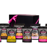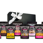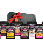 This Holiday Gift Box is an impressive way to celebrate the season, presenting a generous selection of handcrafted gourmet popcorn in an elegant black box.