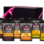 Each Gift Box comes with 6 bags of Prospector Gourmet Popcorn with premium packaging. Our gift boxes are artfully packed in a stylish black box, finished with pink ribbon and tissue paper.