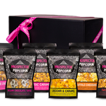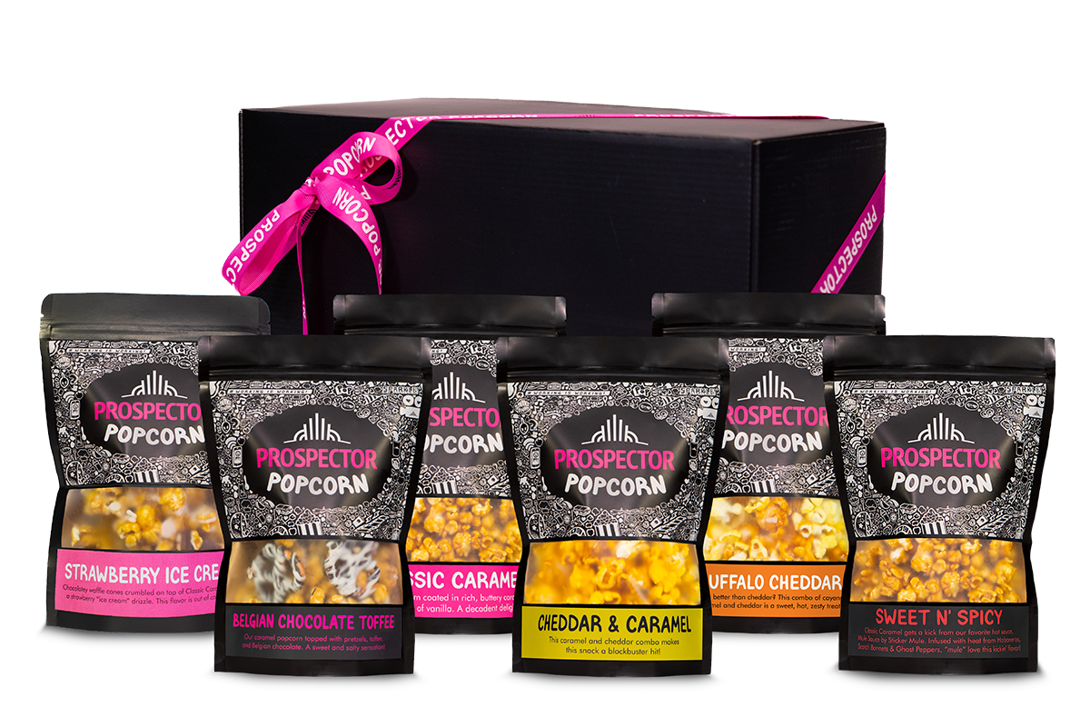 Each Gift Box comes with 6 bags of Prospector Gourmet Popcorn with premium packaging. Our gift boxes are artfully packed in a stylish black box, finished with pink ribbon and tissue paper.