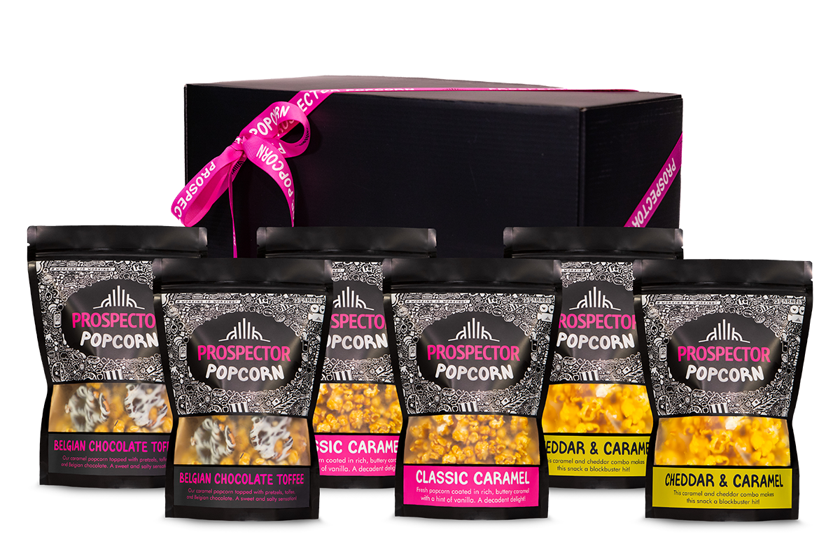 Each Gift Box comes with 6 bags of Prospector Gourmet Popcorn with premium packaging. Our gift boxes are artfully packed in a stylish black box, finished with pink ribbon and tissue paper.